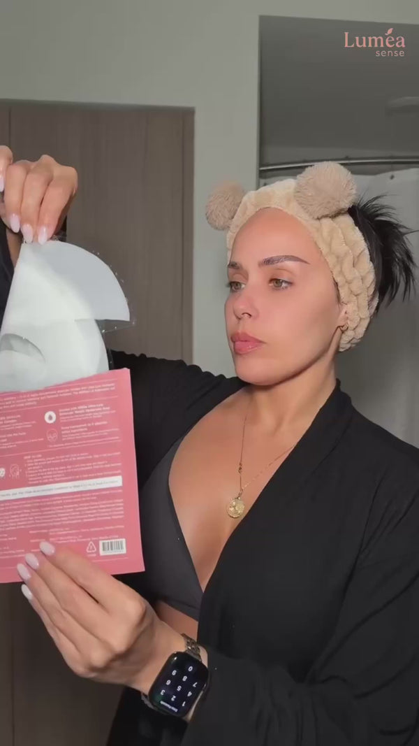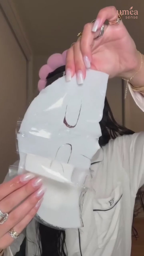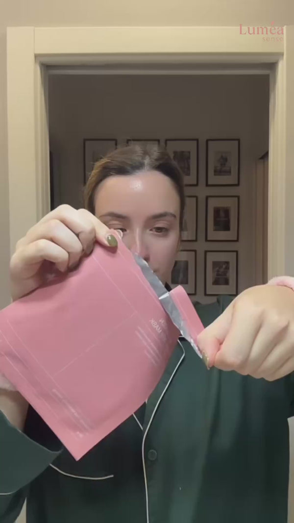 Ouvrez le sachet et retirez le film protecteur de la partie inférieure du masque. Positionnez-la sur le bas de votre visage en faisant correspondre la découpe avec votre bouche. Ensuite, retirez le film de la partie supérieure et positionnez-la sur le haut de votre visage en alignant les découpes avec vos yeux. Lissez bien pour éliminer les bulles d'air. Le masque est le dernier soin de votre routine.